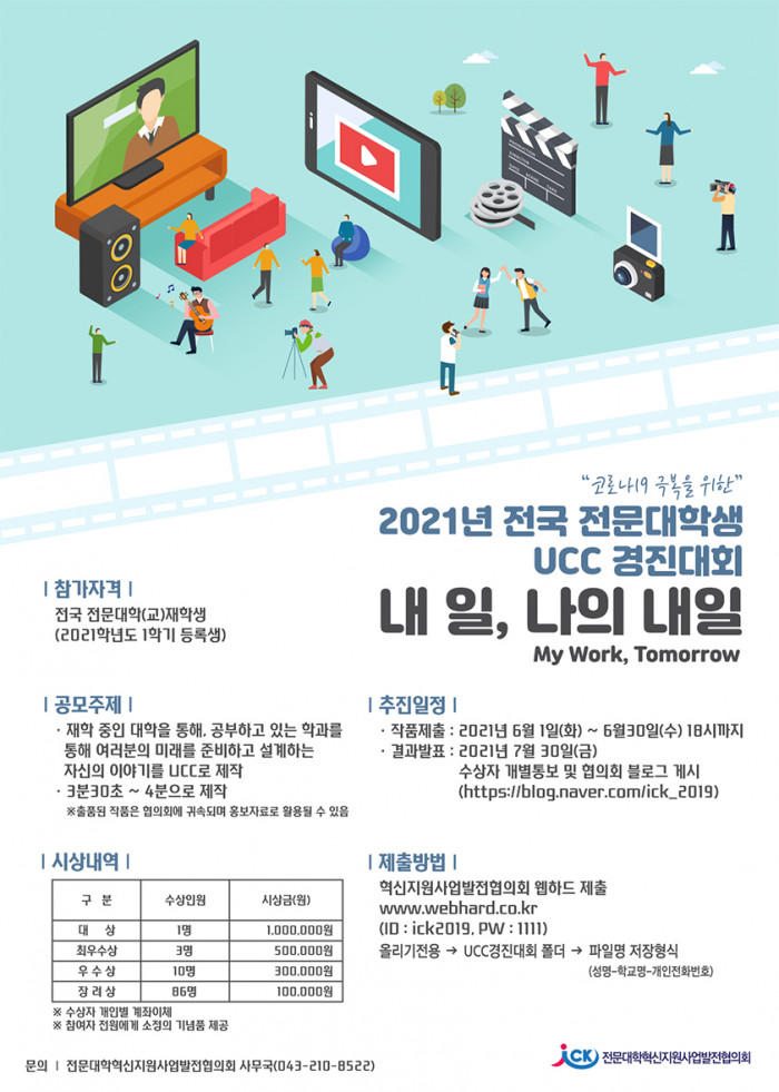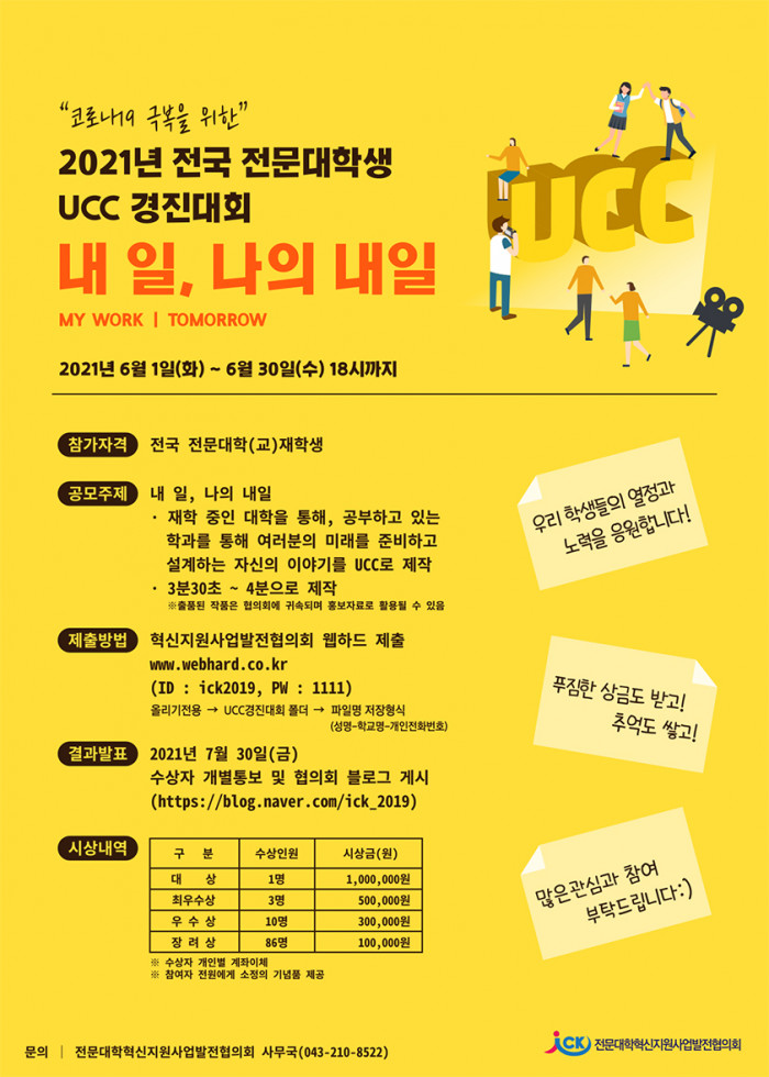 전문대학혁신지원사업발전협의회에서는 코로나19의 확산으로 어려운 상황에서도 학업과 진로설계에 매진하고 있는 전문대학생을 격려하고 우수 사례를 발굴 및 공유하기 위해 아래와 같이 ‘2021년 전국 전문대학생 UCC 경진대회’를 개최합니다.