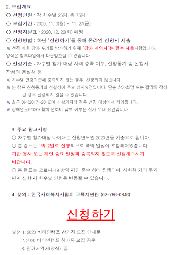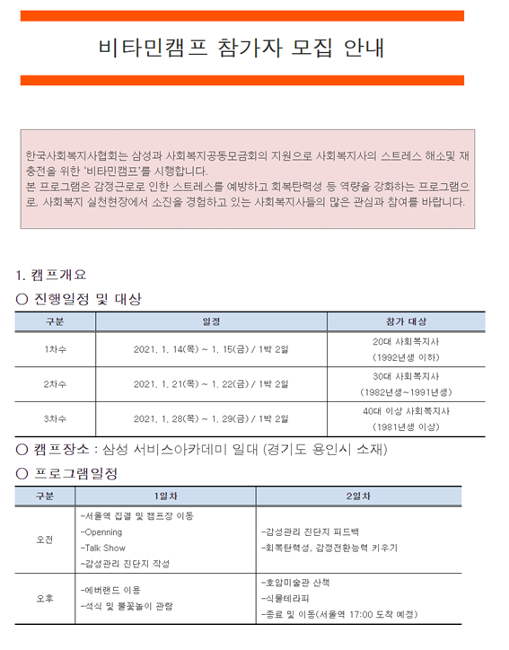 [한국사회복지사협회] '2020 비타민캠프' 참가자 모집 안내 페이지 정보 작성자 사회복지 작성일2020-11-17 18:02 조회2,224회 댓글0건 관련링크 이전글 다음글 목록 본문 댓글목록 등록된 댓글이 없습니다. 이전글 다음글 목록