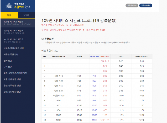교내버스(https://bus.tk.ac.kr/?line=3-2)와 학교 기숙사