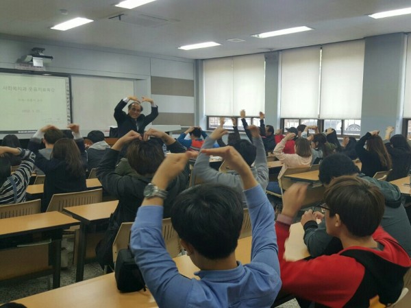 웃음치료 도중 사랑합니다! 존경합니다! 감사합니다! 라는 뜻깊은 명언을 해주시며 하트모양을 몸짓을 하는 1학년 2학년