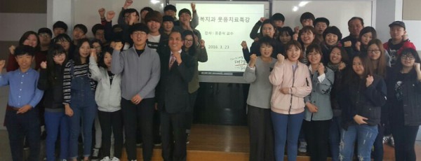 마무리 하는 단체 사진 모습 유운식교수님 시간을 내주셔서 웃음치료 강의 해주셔서 감사합니다!