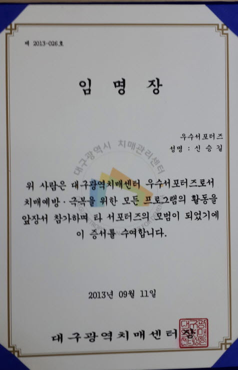 신승길학회장 모범 서포터즈로 임명! 페이지 정보 작성자 관리자 작성일2013-09-16 11:59 조회1,812회 댓글0건 관련링크 이전글 다음글 목록 본문 우리 대경대학교 사회복지과 학회장인 신승길 학생(2학년)이 대구광역치매센터 주최 치매예방,극복 프로그램에서 우수 서포터즈로 활동하여 대구광역치매센터로부터 모범 서포터즈로 임명되었습니다. 축하합니다~!! 이전글 다음글 목록
