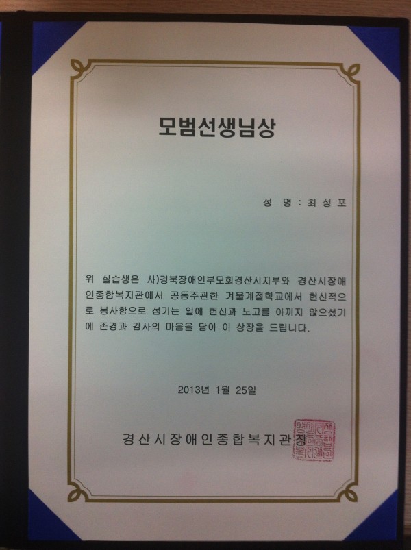 2학영 최성포학생 모범 선생님상 수상 페이지 정보 작성자 관리자 작성일2013-04-01 18:34 조회1,843회 댓글0건 관련링크 이전글 다음글 목록 본문 사회복지과 2학년 최성포학생이 사)경북장애인부모회 경산지시부와 경산시장애인종합복지관에서 공동 주관한 겨울계절학교에서 모범 선생님상을 수상하였습니다. 축하합니다! 이전글 다음글 목록