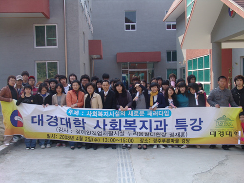 경주푸른마을 페이지 정보 작성자 관리자 작성일2008-04-11 12:06 조회2,305회 댓글0건 관련링크 이전글 다음글 수정 삭제 목록 본문 "중증장애인요양시설 경주푸른마을"로 현장견학수업을 가다!견학 종료 전, 단체기념촬영 이전글 다음글 수정 삭제 목록