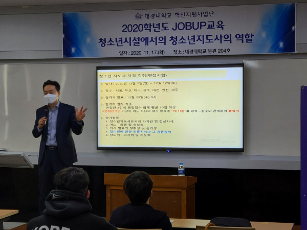 대경대학교 "JOBUP 청소년 지도사" 특강 페이지 정보 작성자 사회복지 작성일2020-11-23 13:54 조회1,161회 댓글0건 관련링크 이전글 다음글 목록 본문 "JOBUP 청소년 지도사" 특강 이전글 다음글 목록