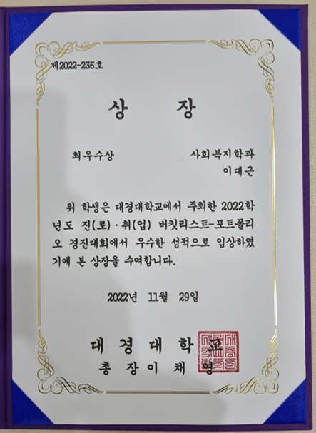 진로취업 버킷리스트-포트폴리오 경진대회 1학년 이대근 최우수상! 페이지 정보 작성자 사회복지 작성일2022-12-02 12:36 조회859회 댓글0건 관련링크 이전글 다음글 목록 본문 진로취업 버킷리스트-포트폴리오 경진대회 1학년 이대근 최우수상! 이전글 다음글 목록